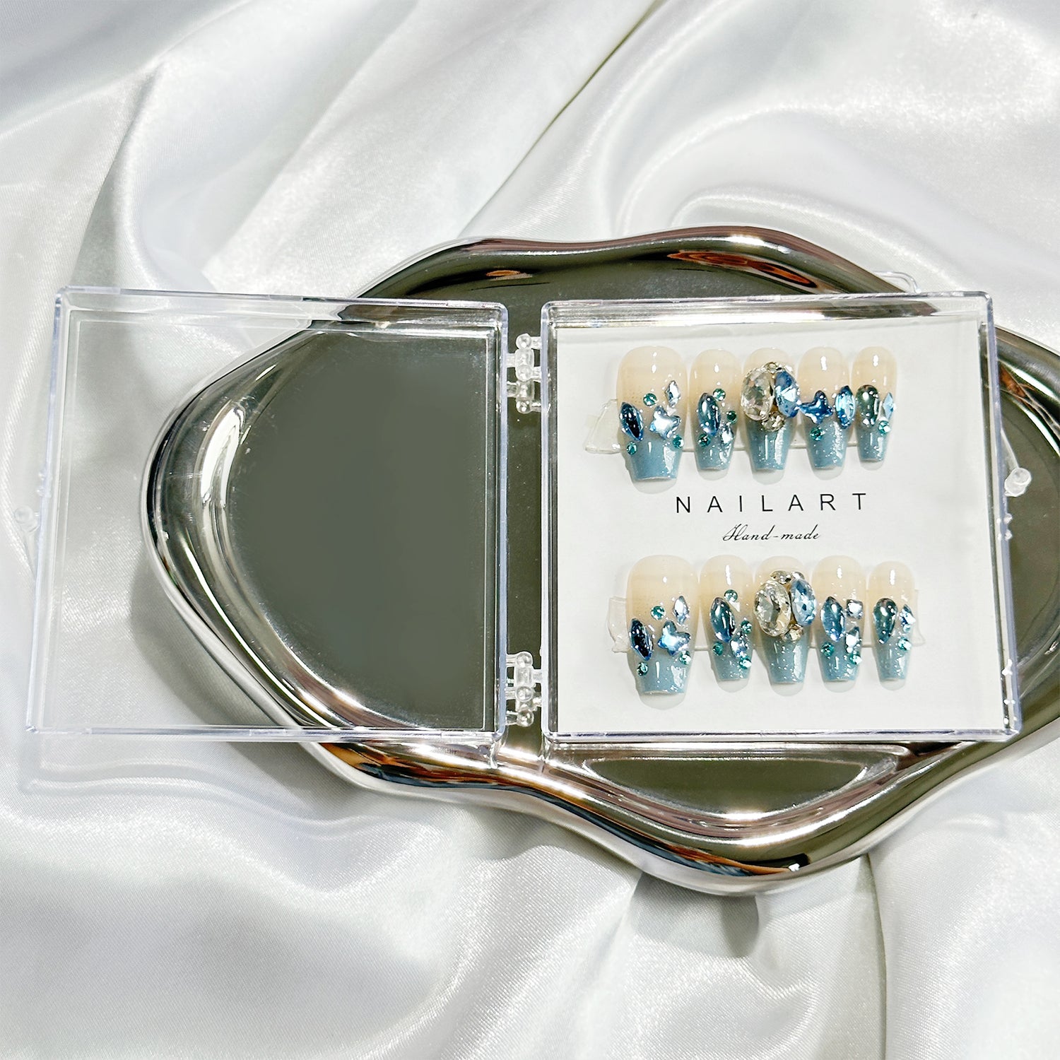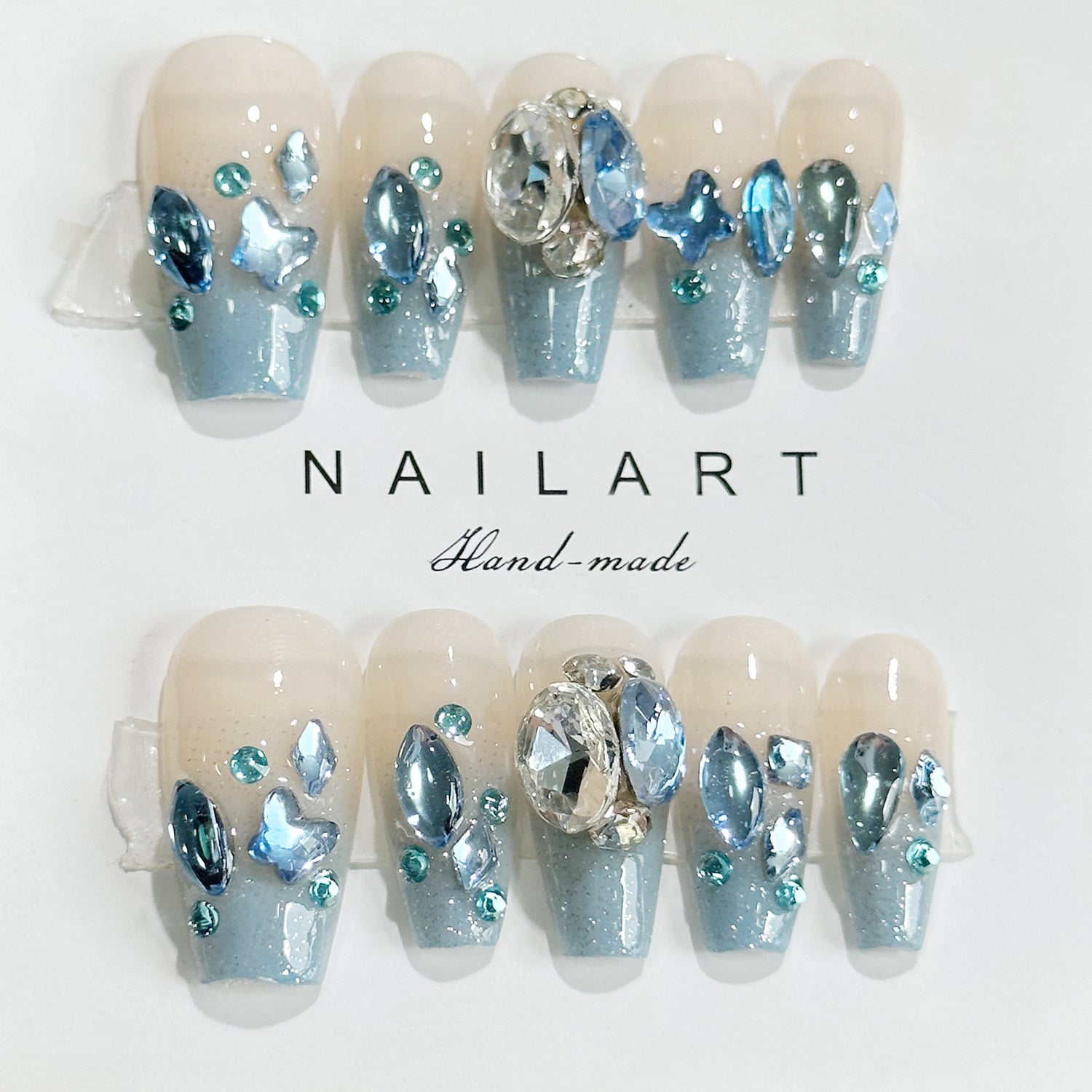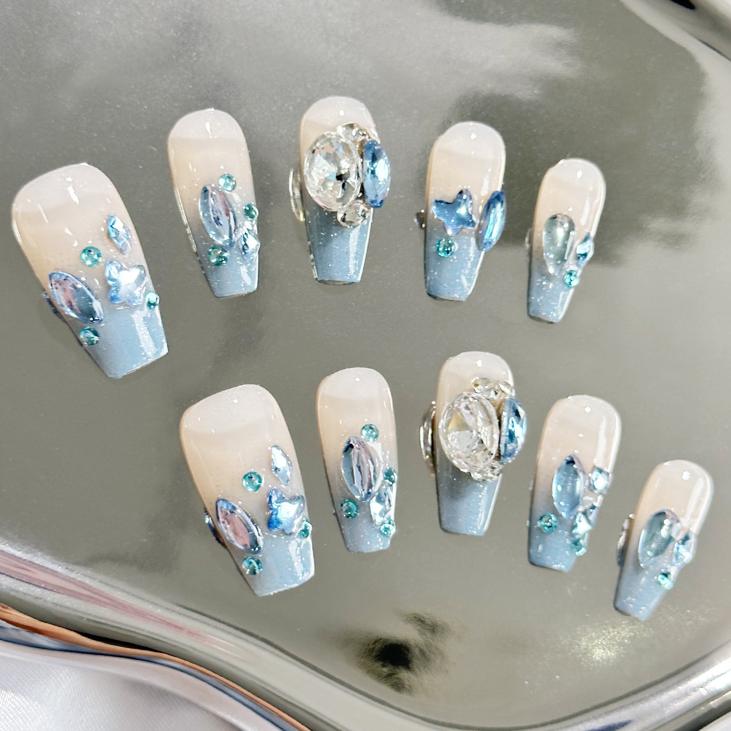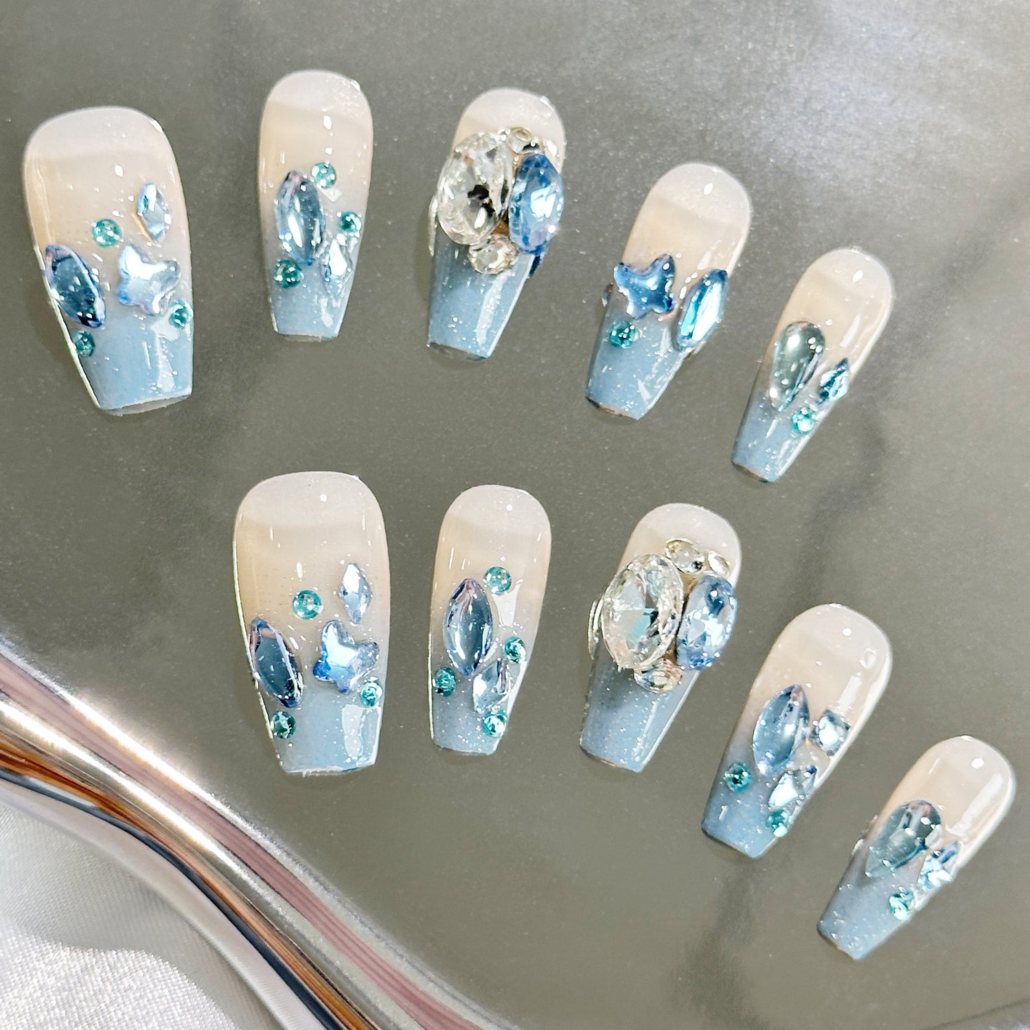Longitud media, forma de ataúd, acabado brillante. Uñas de gel transparentes color nude y azul con punta francesa y delicado diseño de cristal.