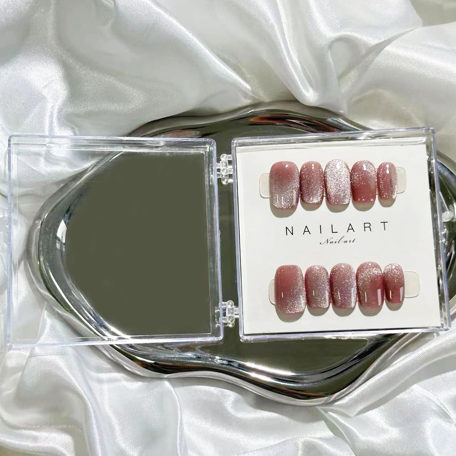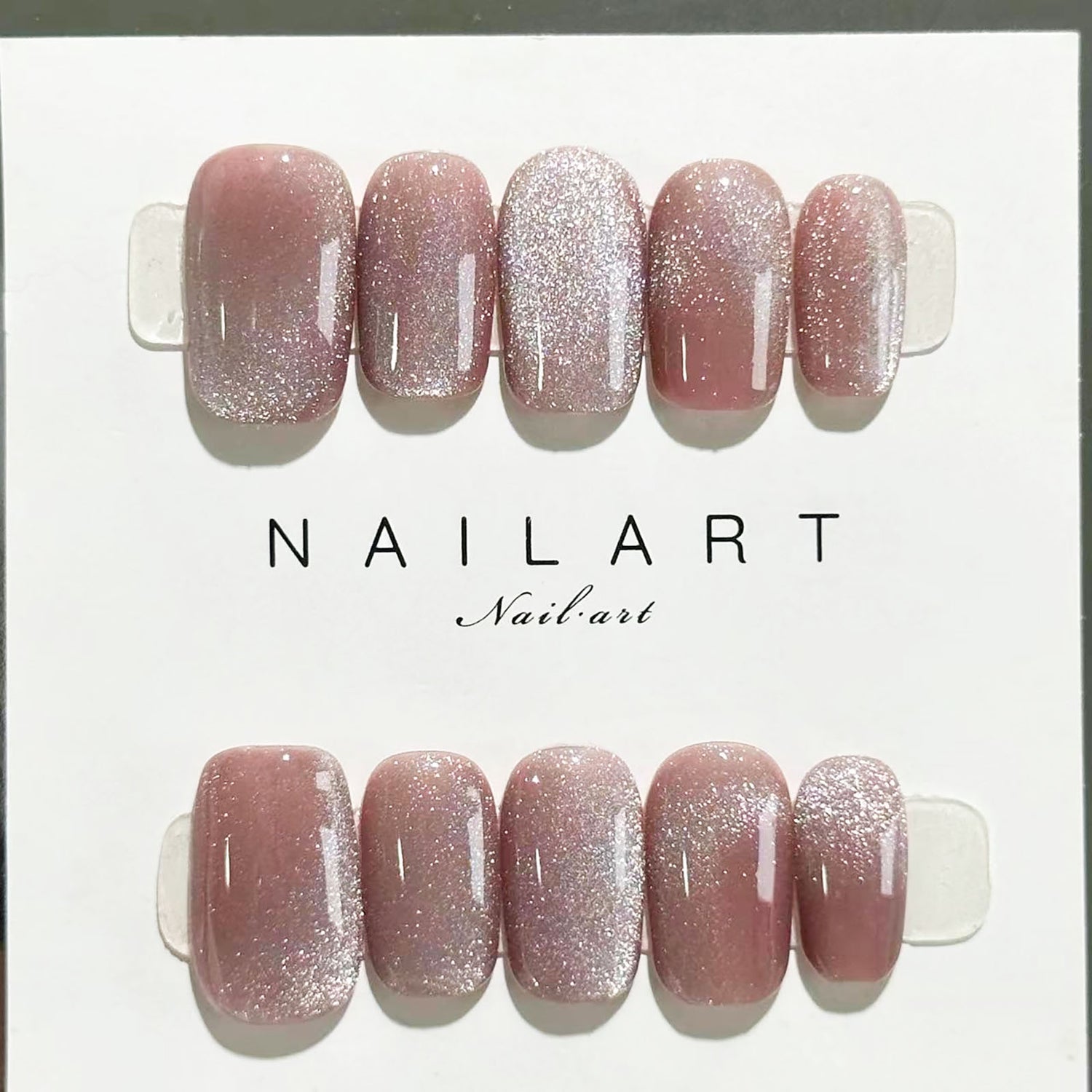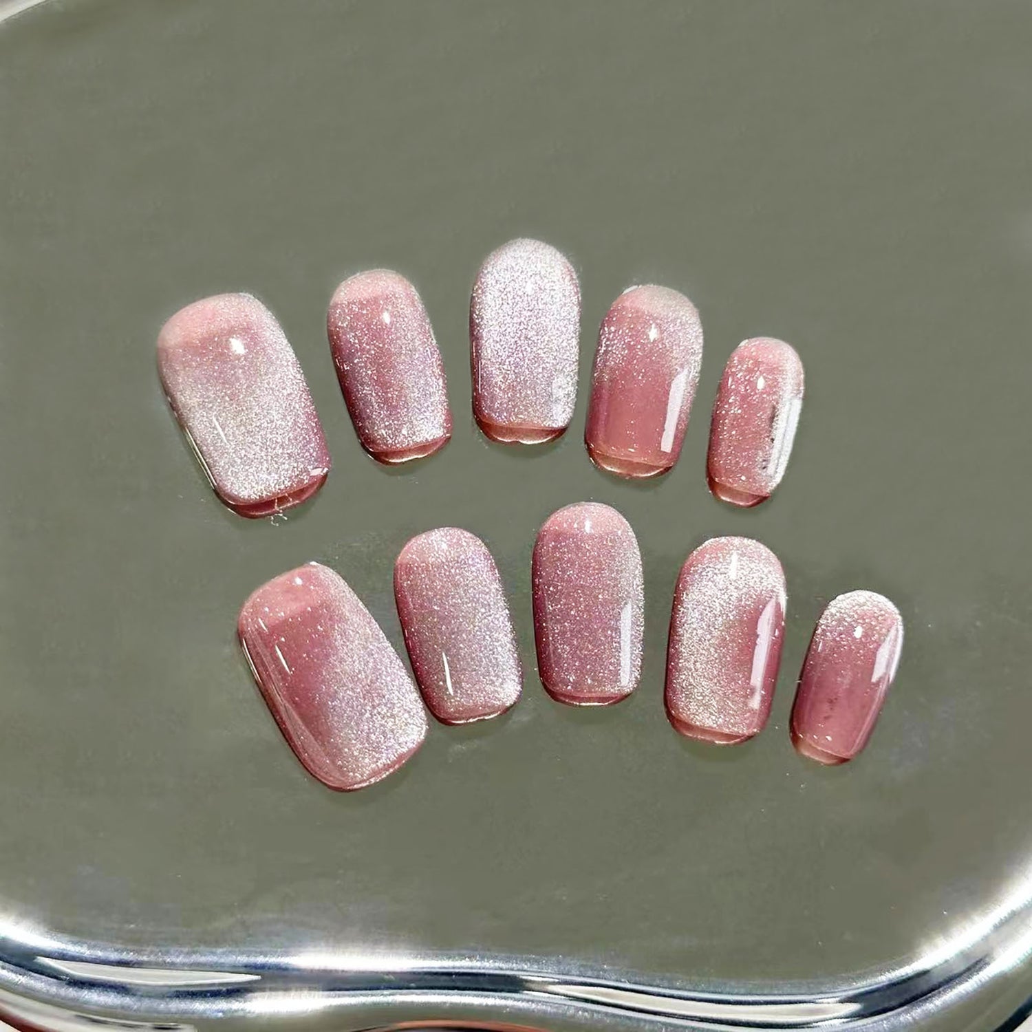 Short length, squoval shape, shimmery finish. Semi-sheer purple press-on gel nails featuring cat eye design.